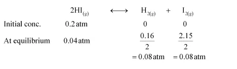 The initial concentration of $\mathrm{HI}$ is $0.2 \mathrm{~atm}$. At equilibrium, it has a partial pressure of $0.04 \mathrm{~atm}$. Therefore, a decrease in the pressure of $\mathrm{HI}$ is $0.2-0.04=0.16$. The given reaction is: