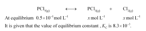 A sample of pure $\mathrm{PCl}_{5}$ was introduced into an evacuated vessel at $473 \mathrm{~K}$. After equilibrium was attained, concentration of $\mathrm{PCl}_{5}$ was found to be $0.5 \times 10^{-1}$ mol $\mathrm{L}^{-1}$. If value of $K_{c}$ is $8.3 \times 10^{-3}$, what are the concentrations of $\mathrm{PCl}_{3}$ and $\mathrm{Cl}_{2}$ at equilibrium?