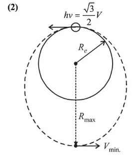 $-\frac{G M m}{R_{e}}+\frac{1}{2} m\left(\sqrt{\frac{3}{2}} V\right)^{2}=\frac{G M m}{R_{\max }}+\frac{1}{2} m V_{\min }^{2}$ ....(1)