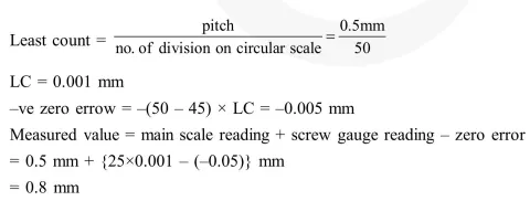 A screw gauge with a pitch of $0.5 \mathrm{~mm}$ and a circular scale with 50 divisions is used to measure the thickness of a thin sheet of Aluminium. Before starting the measurement, it is found that when the two jaws of the screw gauge are brought in contact, the $45^{\text {th }}$ division coincides with the main scale line and that the zero of the main scale is barely visible. What is the thickness of the sheet if the main scale reading is $0.5 \mathrm{~mm}$ and the $25^{\text {th }}$ division coincides with the main scale line ?
