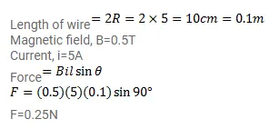 A semi-circular wire of radius $5.0 \mathrm{~cm}$ and carries a current of $5.0 \mathrm{~A}$. A magnetic field B of magnitude $0.50 \mathrm{~T}$ exists along the perpendicular to the plane of the wire. Find the magnitude of the magnetic force acting on the wire.