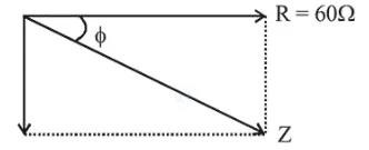 Given: $R^{\prime}=60 \Omega, f=50 H z, \omega=2 \pi f=100 \pi$ and $v=24 v$ $\mathrm{C}=120 \mu \mathrm{f}=120 \times 10^{-6} \mathrm{f}$