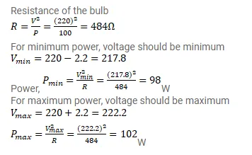 A servo voltage stabilizer restricts the voltage output to $220 \mathrm{~V} \pm 1 \%$. If an electric bulb rated at $220 \mathrm{~V}, 100 \mathrm{~W}$ is connected to it, what will be the minimum and maximum power consumed by it?
