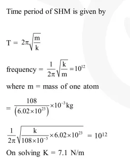 A silver atom in a solid oscillates in simple harmonic motion in some direction with a frequency of $10^{12} / \mathrm{sec}$. What is the force constant of the bonds connecting one atom with the other ? (Mole wt. of silver $=108$ and Avagadro number $=6.02 \times 10^{23} \mathrm{gm} \mathrm{mole}^{-1}$ )