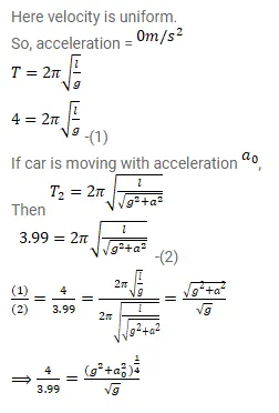 A simple pendulum fixed in a car has a time period of 4 seconds when the car is moving uniformly on a horizontal road. When the accelerator is passed, the time period changes to $3.99$ seconds. Making an approximation analysis, find the acceleration of the car.
