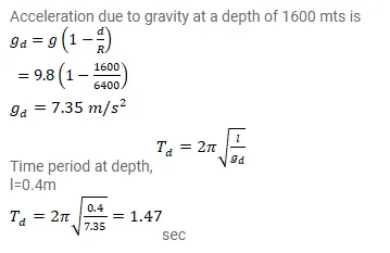 A simple pendulum of length $40 \mathrm{~cm}$ is taken inside a deep mine. Assume for the time being that the mine is $1600 \mathrm{~km}$ deep. Calculate the time period of the pendulum there. Radius of the earth $=6400 \mathrm{~km}$.