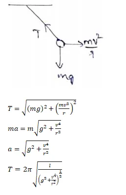 A simple pendulum of length $I$ is suspended from the ceiling of the car moving with a speed $v$ on a circular horizontal road of radius $\mathrm{r}$. (a) Find the tension in the string when it is at rest with respect to car. (b) Find the time period of small oscillation.