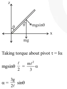 A slender uniform rod of mass $\mathrm{M}$ and length $\ell$ is pivoted at one end so that it can rotate in a vertical plane (see figure). There is negligible friction at the pivot. The free end is held vertically above the pivot and then released. The angular acceleration of the rod when it makes an angle $\theta$ with the vertical is :