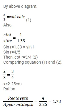 A small object is placed at the center of the bottom of a cylindrical vessel of radius $3 \mathrm{~cm}$ and height $4 \mathrm{~cm}$ filled completely with water. Consider the ray leaving the vessel through a corner. Suppose this ray and the ray along the axis of the vessel are used to trace the image. Find the apparent depth under the assumption taken. Refractive index of water is $-1.33 .$