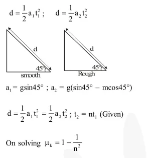 A smooth block is released at rest on a $45^{\circ}$ incline and then slides a distance $\mathrm{d}$. The time taken to slide is $\mathrm{n}$ times as much to slide on rough incline than on a smooth incline. The coefficient of friction is-