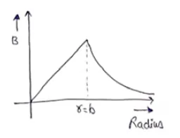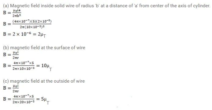 A solid wire of radius $10 \mathrm{~cm}$ carries a current of $5.0 \mathrm{~A}$ distributed uniformly over its cross-section. Find the magnetic field $B$ at a point at a distance
