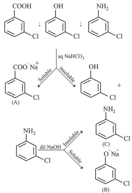 A solution of $m$-chloroaniline, $m$-chlorophenol and $m$-chlorobenzoic acid in ethyl acetate was extracted initially with a saturated solution of $\mathrm{NaHCO}_{3}$ to give fraction $A$. The left over organic phase was extracted with dilute $\mathrm{NaOH}$ solution to give fraction $B$. The final organic layer was labelled as fraction $C$. Fractions $A, B$ and $C$, contain respectively: