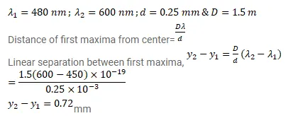 A source of light emitting light of wavelengths $480 \mathrm{~nm}$ and $600 \mathrm{~nm}$ is used in a double slit interference experiment. The separation between the slits is $0.25 \mathrm{~mm}$ and the interference is observed on a screen placed at $150 \mathrm{~cm}$ from the slits. Find the linear separation between the first maximum (next to the central maximum) corresponding to the two wavelengths.