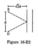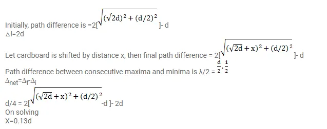 A source $S$ and a detector $D$ are placed at a distance $d$ apart. A big cardboard is placed at a distance $\sqrt{2} d$ from the source and the detector as shown in figure. The source emits a wave of wavelength $=d / 2$ which is received by the detector after reflection from the cardboard. It is found to be in phase with the direct wave received from the source. By what minimum distance should the cardboard be shifted away so that the reflected wave becomes out of phase with the direct wave?