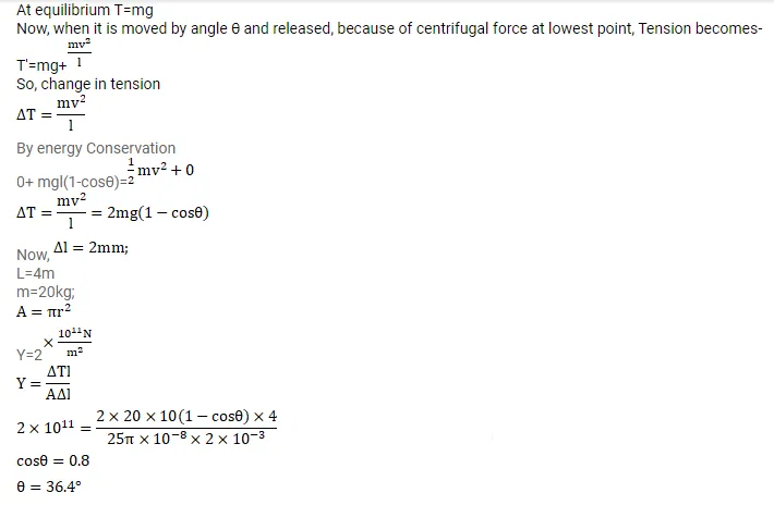 A sphere of mass $20 \mathrm{~kg}$ is suspended by a metal wire of unstretched length $4 \mathrm{~m}$ and diameter $1 \mathrm{~mm}$. When in equilibrium, there is a clear gap of $2 \mathrm{~mm}$ between the sphere and the floor. The sphere is gently pushed aside so that the wire makes an angle $\theta$ with the vertical and is released. Find the maximum value of $\theta$ so that the sphere does not rub the floor. Young's modulus of the metal of the wire $2.0 \times 10^{11} \mathrm{~N} / \mathrm{m}^{2}$. Make appropriate approximations.