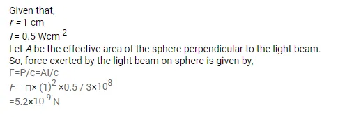A sphere of radius $1.00 \mathrm{~cm}$ is placed in the path of a parallel beam of light of large aperture. The intensity of the light is $0.5 \mathrm{~W}$ $\mathrm{cm}^{-2}$. If the sphere completely absorbs the radiation falling on it, find the force exerted by the light beam on the sphere.