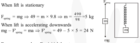 A spring balance is attached to the ceiling of a lift. A man hangs his bag on the spring and the spring reads $49 \mathrm{~N}$, when the lift is stationary. If the lift moves downward with an acceleration of $5 \mathrm{~m} / \mathrm{s}^{2}$, the reading of the spring balance will be