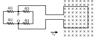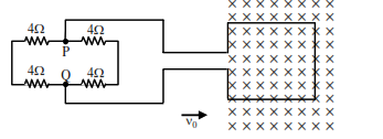 A square loop of side $20 \mathrm{~cm}$ and resistance $1 \Omega$ is moved towards right with a constant speed $v_{0}$. The right arm of the loop is in a uniform magnetic field of $5 \mathrm{~T}$. The field is perpendicular to the plane of the loop and is going into it. The loop is connected to a network of resistors each of value $4 \Omega$. What should be the value of $v_{0}$ so that a steady current of $2 \mathrm{~mA}$ flows in the loop ?
