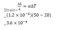 A steel rod is clamped at its two ends and rests on fixed horizontal base. The rod is unstrained at $20^{\circ} \mathrm{C}$ Find the longitudinal strain developed in the rod if the temperature rises to $50^{\circ} \mathrm{C}$. Coefficient of linear expansion of steel $=1.2^{\times 10^{-5} /{ }^{\circ} \mathrm{C}}$