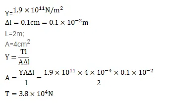 A steel rod of cross-sectional area $4 \mathrm{~cm}^{2}$ and length $2 \mathrm{~m}$ shrinks by $0.1 \mathrm{~cm}$ as the temperature decreases in night. If the rod is clamped at both ends during the day hours, find the tension developed in it during night hours. Young's modulus of steel = $1.9 \times 10^{11} \mathrm{~N} / \mathrm{m} 2$.