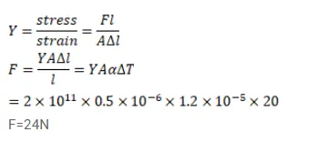 A steel wire of cross-sectional area $0.5 \mathrm{~mm}^{2}$ is held between two fixed supports. If the wire is just taut at $20^{\circ} \mathrm{C}$, determine the tension when the temperature falls to $0^{\circ} \mathrm{C}$. Coefficient of linear expansion of steel is $1.2^{\times 10^{-5} /{ }^{\circ} \mathrm{C}}$ and its Young'smodulus is $2.0^{\times 10^{11}} \mathrm{~N} / \mathrm{m}^{2}$
