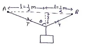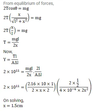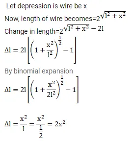 A steel wire of original length $1 \mathrm{~m}$ and cross-sectional area $4.00 \mathrm{~mm}^{2}$ is clamped at the two ends so that it lies horizontally and without tension. If a load of $2.1 \mathrm{~kg}$ is suspended from the middle point of the wire, what would be its vertical depression? $\mathrm{Y}$ of the steel $=2.0 \times 10^{11} \mathrm{~N} / \mathrm{m}^{2}$. Take $\mathrm{g}=10 \mathrm{~m} / \mathrm{s}^{2}$