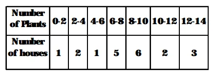 A survery was conducted by a group of students as a part of their environment awareness programme, in which they collected the following data regarding the number of plants in 20 houses in a locality. Find the mean number of plants per house.