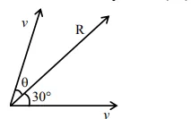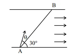 A swimmer wants to cross a river from point A to point B. Line AB makes an angle of 30° with the flow of river. Magnitude of velocity of the swimmer is same as that of the river. The angle with the line AB should be ____°, so that the swimmer reaches point B.
