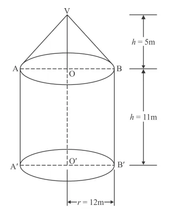 Diameter of cylinder = 24 m, Height if cylindrical portion = 11 m and the vertex of the cone is 16 meters above the ground. We have to find the area of canvas required for the tent.