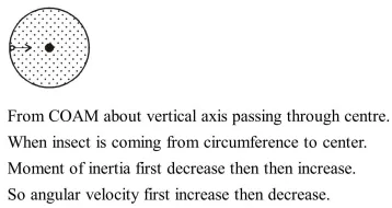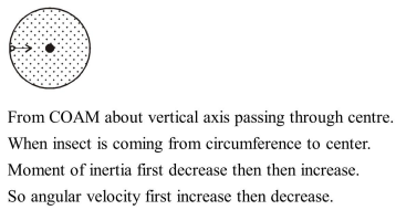 A thin horizontal circular disc is rotating about a vertical axis passing through its centre. An insect is at rest at a point near the rim of the disc. The insect now moves along a diameter of the disc to reach its other end. During the journey of the insect, the angular speed of the disc :-