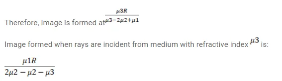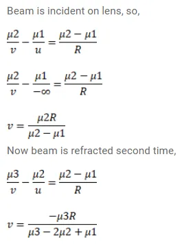 A thin lens made of a material of refractive index $\mu 2$ has a medium of refractive index $\mu 1$ on one side and a medium of refractive index $\mu 2$ on the other side. The lens is biconvex and the two radii of curvature have equal magnitude R. A beam of light travelling parallel to the principal axis is incident on the lens. Where will the image be formed if the beam is incident from (a) the medium $\mu 1$ (b) from the medium $\mu s$ ?