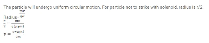 A tightly-wound, long solenoid has $\mathrm{n}$ turns per unit length, a radius $\mathrm{r}$ and carries a current $\mathrm{i}$. A particle having charge $q$ and mass $m$ is projected from a point on the axis in a direction perpendicular to the axis. What can be the maximum speed for which the particle does not strike the solenoid?