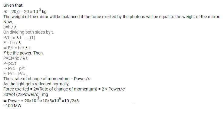 A totally reflecting, small plane mirror placed horizontally faces a parallel beam of light, as shown in the figure. The mass of the mirror is $20 \mathrm{~g}$. Assume that there is no absorption in the lens and that $30 \%$ of the light emitted by the source goes through the lens. Find the power of the source needed to support the weight of the mirror.