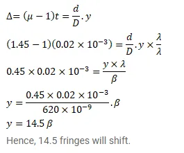A transparent paper (refractive index=1.45) of thickness $0.02 \mathrm{~mm}$ is pasted on one of the slits of a Young's slit experiment which uses monochromatic light of wavelength $620 \mathrm{~nm}$. How many fringes will cross through the centre if the paper is removed?