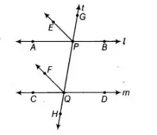 Given Two lines AB and CD are parallel and intersected by transversal t at P and 0, respectively. Also, EP and FQ are the bisectors of angles ∠APG and ∠CQP, respectively.