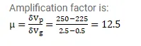 A triode value operates at $\mathrm{V}_{\mathrm{p}}=225 \mathrm{~V}$ and $\mathrm{V}_{\mathrm{g}}=-0.5 \mathrm{~V}$. The plate current remains unchanged if the plate voltage is increased to $250 \mathrm{~V}$ and the grid voltage is decreased to $-2.5 \mathrm{~V}$. Calculate the amplification factor.