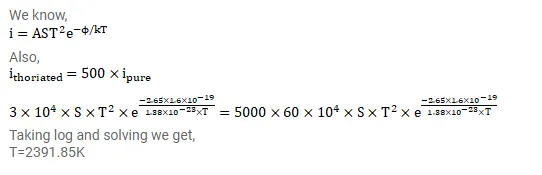 A tungsten cathode and a thoriated-tungsten cathode have same geometrical dimensions and are operated at the same temperature. The thoriated-tungsten cathode gives 5000 times more current than the other one. Find the operating temperature. Take relevant data from the previous problem.