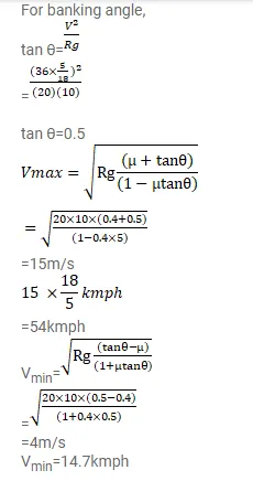 A turn of radius $20 \mathrm{~m}$ is banked for the vehicles going at a speed of $36 \mathrm{~km} / \mathrm{h}$. If the coefficient of static friction between the road and the tyre is $0.4$, what are the possible speeds of a vehicle so that it neither slips down nor skids up?