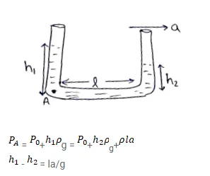 A U-tube containing a liquid is accelerated horizontally with a constant acceleration $\mathrm{a}_{0}$. If the separation between the vertical limbs is I, find the difference in the heights of the liquid in the two arms.