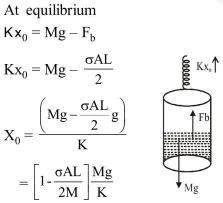 A uniform cylinder of length $\mathrm{L}$ and mass $\mathrm{M}$ having cross- sectional area A is suspended, with its length vertical, form a fixed point by a massless spring, such that it is half submerged in a liquid of density $\sigma$ at equilibrium position. The extension $x_{0}$ of the spring when it is in equilibrium is :