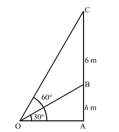 A vertical tower stands on a horizontal plane and is surmounted by a vertical flagstaff of height 6 m. At a point on the plane, the angle of elevation of the bottom of the flagstaff is 30° and that of the top of the flagstaff is 60°. Find the height of the tower. [Use $\sqrt{3}=1.732]$