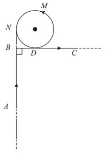 A very long wire $A B D M N D C$ is shown in figure carrying current $I$. $A B$ and $B C$ parts are straight, long and at right angle. At $D$ wire forms a circular turn $D M N D$ of radius $R$.