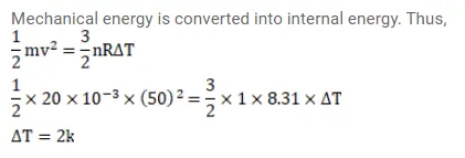 A vessel containing one mole of a monatomic ideal gas (molecular weight $=20 \mathrm{~g} / \mathrm{mol}$ ) is moving on a floor at a speed of $50 \mathrm{~m} / \mathrm{s}$. The vessel is stopped suddenly. Assuming that the mechanical energy lost has gone into the internal energy of the gas, find the rise in its temperature.