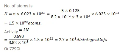 A vessel of volume $125 \mathrm{~cm}^{3}$ contains tritium $\left({ }^{3} \mathrm{H}, \mathrm{t}_{1 / 2}=12.3 \mathrm{y}\right)$ at $500 \mathrm{kPa}$ and $300 \mathrm{k}$. Calculate the activity of the gas. PV=nRT= $\frac{m}{n} R T$