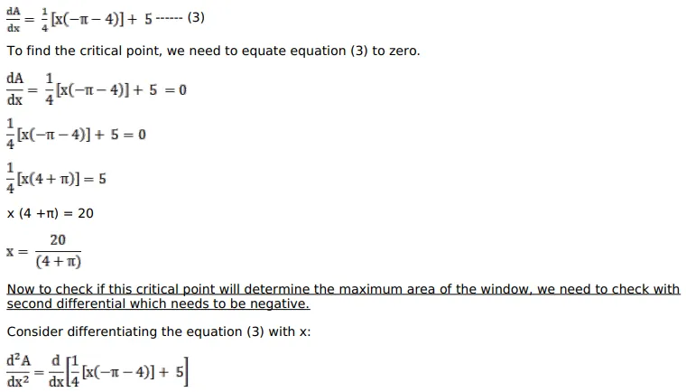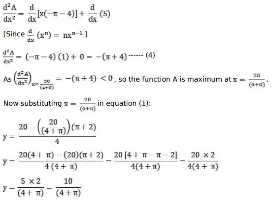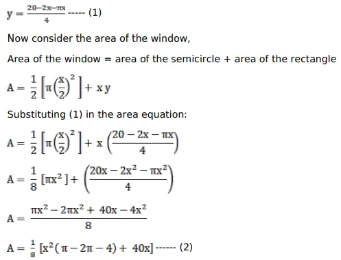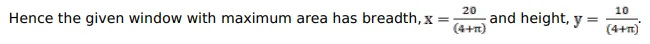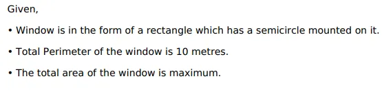 A window is in the form of a rectangle surmounted by a semicircular opening. The total perimeter of the window is 10 metres. Find the dimensions of the windows to admit maximum light through it.