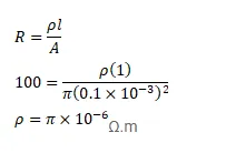 A wire of length $1 \mathrm{~m}$ and radius $0.1 \mathrm{~mm}$ has a resistance of $100 \Omega$. Find the resistivity of the material.