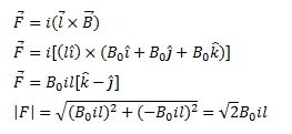 A wire of length I carries a current i along the X-axis. A magnetic field exists which is given as $\vec{B}=B_{0}(\hat{\imath}+\hat{\jmath}+\hat{k})_{\mathrm{T}}$. Find the magnitude of the magnetic force acting on the wire.