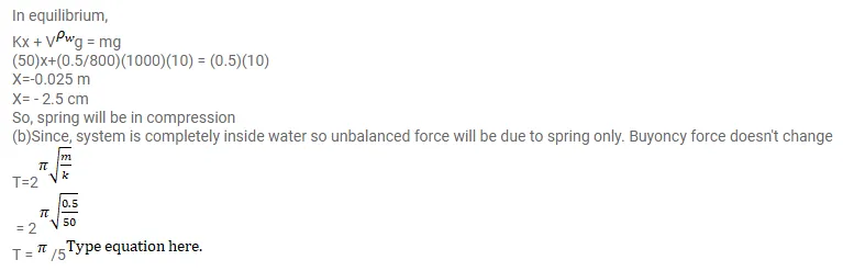 A wooden block of mass $0.5 \mathrm{~kg}$ and density $800 \mathrm{~kg} / \mathrm{m}^{3}$ is fastened to the free end of a vertical spring of spring constant 50 $\mathrm{N} / \mathrm{m}$ fixed at the bottom. If the entire system is completely immersed in water, find
