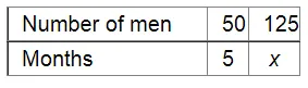 A work force of 50 men with a contractor can finish a piece of work in 5 months. In how many months the same work can be completed by 125 men?