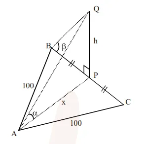 $\mathrm{ABC}$ is a triangular park with $\mathrm{AB}=\mathrm{AC}=100$ metres. A vertical tower is situated at the mid-point of BC. If the angles of elevation of the top of the tower at $\mathrm{A}$ and $\mathrm{B}$ are $\cot ^{-1}(3 \sqrt{2})$